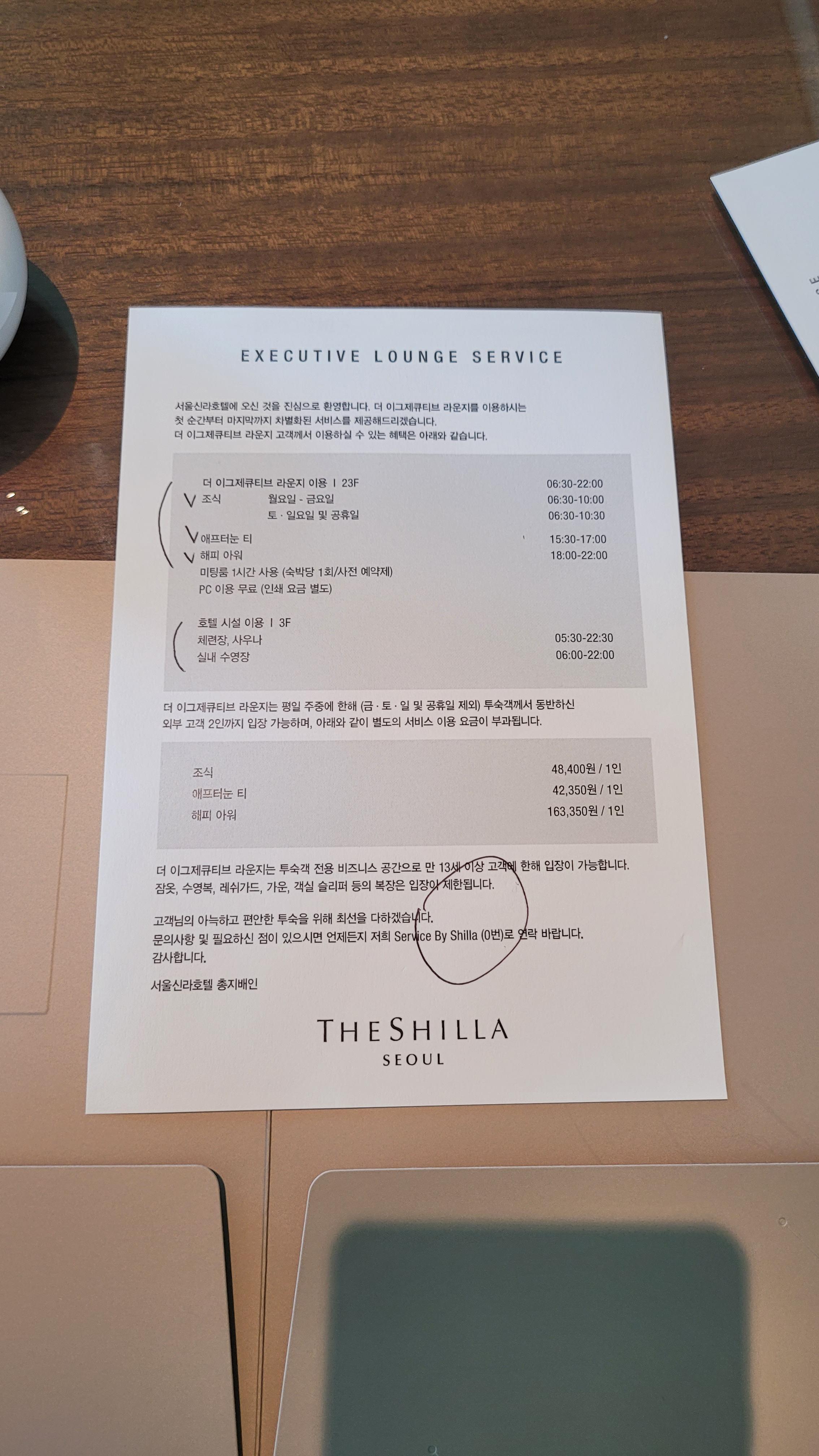 체크인 할 때 받는 용지에 라운지 이용시간 적혀있뚬