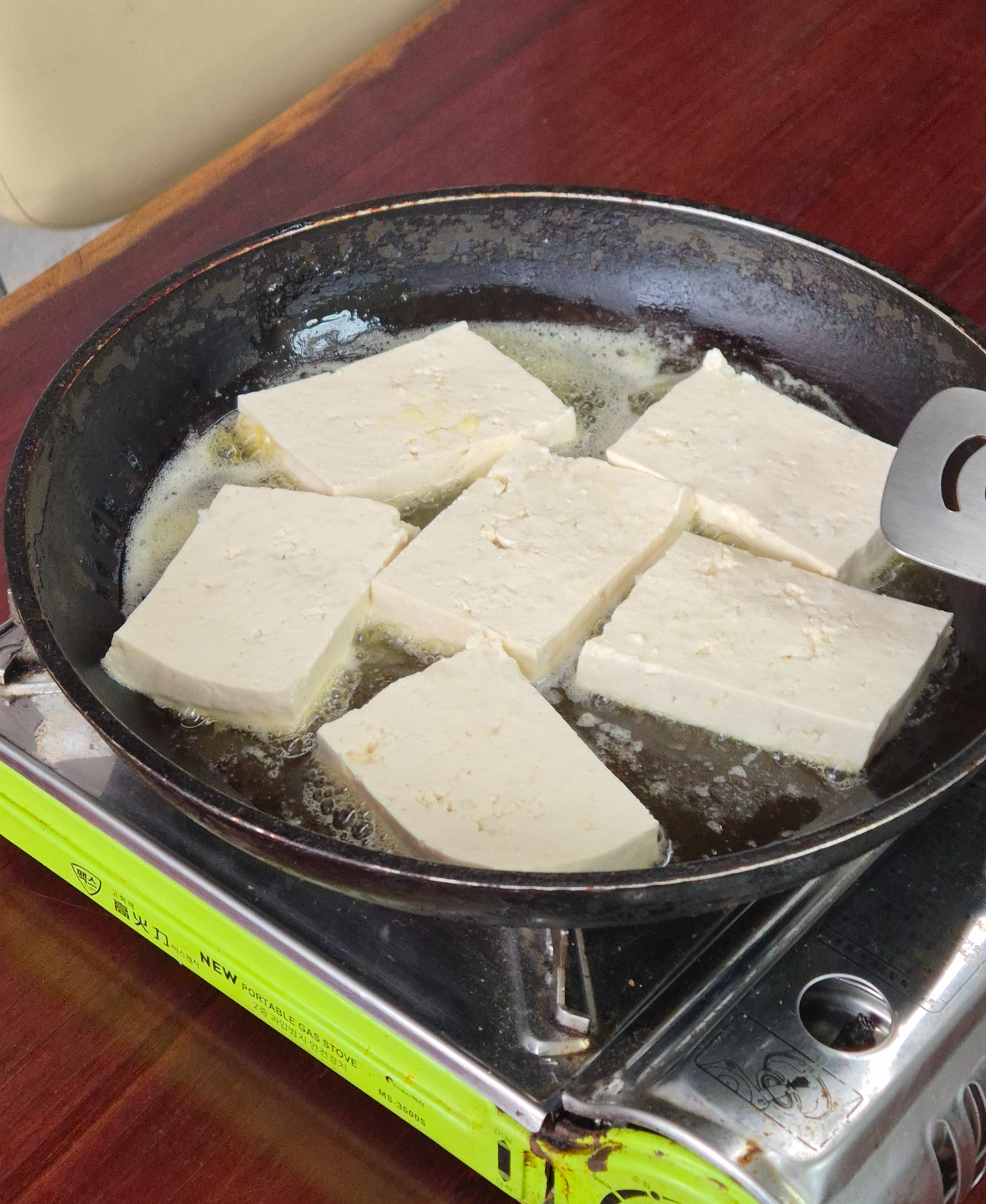 먼저, 들기름 두부구이가 나왔다. 들기름 가득한 팬에 큼직한 두부 6조각. 이게 1인분이다.